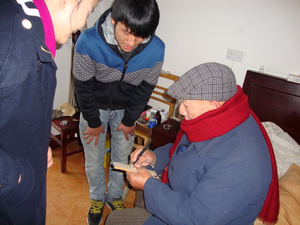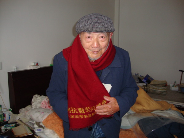 当志愿者把国家记忆挂历送到老人手中,把印有向抗战老兵致敬的红色羊绒围巾给杨老戴到脖子上时,老人眼含热泪高兴的连声称谢,并要求记下志愿者的姓名和地址,志愿者还朗读了爱心人士写给抗战老兵的一份家书。整个下午杨老都沉浸在喜悦之中,临别时抓着志愿者的手一直送到楼道电梯口,不舍离去。