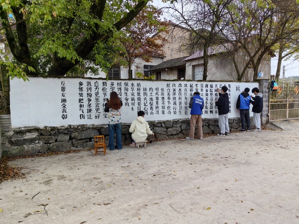 本次活动主要是对红旗村西湖组、建楼组、芦塘组和石滩组部分居民院落围墙进行设计和墙绘,墙绘总面积约1000多平方米,共有30多名师生参与了此次活动。师生们根据村庄的自然风景和文化传承,精心设计了以“学习宣传贯彻党的二十大精神”为主题的墙绘方案,展示了“建设宜居宜业和美乡村”的乡村振兴新风貌。参与活动的师生分工合作、高效有序、有条不紊地开展墙绘工作。构图、起形、调色、上色、精修,精雕细琢、细致刻画,反复打磨每一面墙绘、认真勾勒每一个细节,从构思、设计到最后的勾线,无一不细细考量,笔笔用心。萧瑟冬雨中,一件件雨衣中是一颗颗炙热的爱党爱国的红心。师生用汗水和劳动描绘美、培育美和传播美,将“党的二十大精神”与“乡村振兴战略”用墙绘的方式呈现,用美的方式传播“听党话,跟党走”的坚定信念。经过2天的奋笔绘画,一幅幅主题墙绘跃然于墙,与村居、道路等一起融汇成了一幅美丽的图画。所有墙绘作品均主题鲜明,立意新颖,既贴合乡村实际,又具有浓厚的艺术性,得到了村民的一致认可与赞赏。