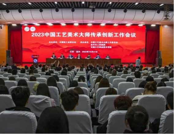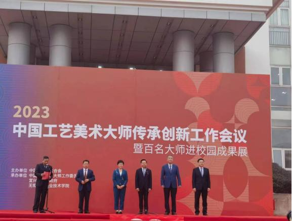 为深入贯彻落实习近平总书记文化思想精神,推动中国工艺美术传承创新,进一步发挥工艺美术大师引领行业发展的重要作用,深化百名大师进校园活动,10月27-28日,中国轻工业联合会在宜兴召开中国工艺美术大师传承创新工作会议,总结部署大师传承创新相关工作,同期举办工艺美术系列工作会议和百名大师进校园成果展。中国轻工业联合会会长、中国工艺美术大师工作委员会主任张崇和,江苏省教育厅副厅长曹玉梅,中国轻工业联合会副会长、中国工艺美术大师工作委员会副主任何烨,中国轻工业联合会副会长、全国工艺美术标委会主任刘江毅,教育部职成司教学与质量处处长张磊,无锡工艺职业技术学院党委书记丁钢,宜兴市副市长张达志,无锡工艺职业技术学院院长孙振球,江苏省轻工厅原厅长陈世爱出席会议。会议由中国轻工业联合会纪委书记、中国工艺美术大师工作委员会副主任陶小年主持。芜湖职业技术学院中国工艺美术大师传承创新基地代表应邀参会。