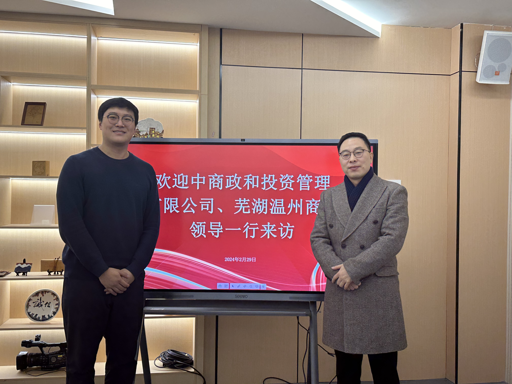 2024年2月29日上午,中商政和投资管理有限公司、芜湖温州商会领导一行来艺术传媒学院进行考察交流。双方在副院长江保锋的主持下,在学院二楼艺术沙龙召开了交流座谈会。