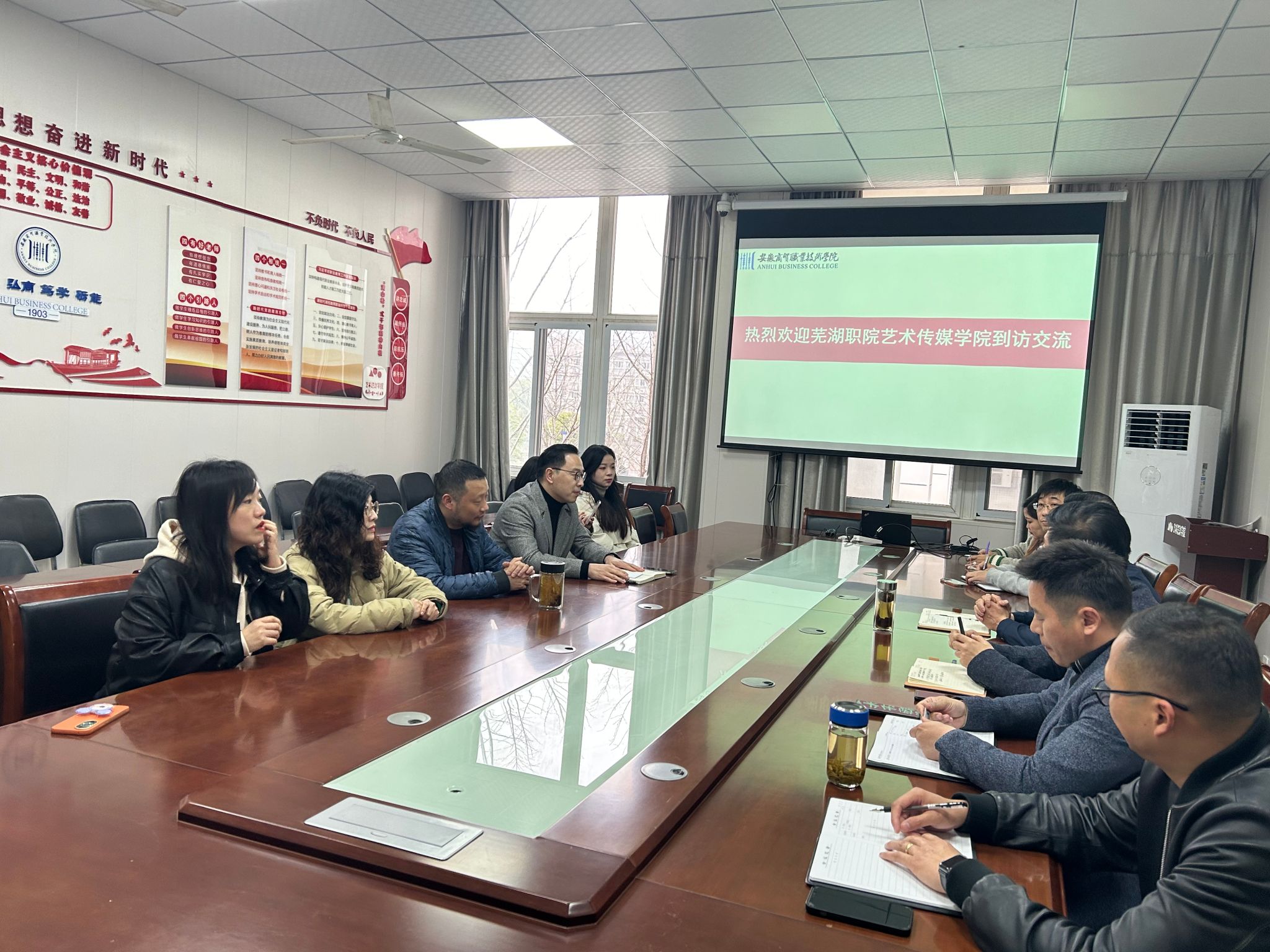 3月27日,艺术传媒学院副院长江保锋一行赴安徽商贸职业技术学院艺术设计学院进行考察与交流。安徽商贸职业技术学院艺术设计学院院长吴昊、副院长孙湛等对艺传一行表示热烈欢迎,并在学院会议室举行了座谈会。