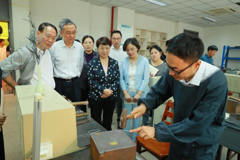 6月7日上午,安徽省人大常委会副主任、省工商联主席、省总商会会长王翠凤率省人大常委会执法检查组一行来校实地检查芜湖铁画省级非遗传承基地建设情况。芜湖市人大常委会党组书记、主任丁祖荣,芜湖市人大常委会副主任王芳,芜湖市人大常委会教育科学文化卫生工作委员会副主任季学敏,芜湖市政府副秘书长孙万胜,芜湖市文化和旅游局党组书记、芜湖市文化和旅游局局长王玉娟,校党委副书记、校长高武,副校长刘育红,艺术传媒学院副院长江保锋陪同检查。